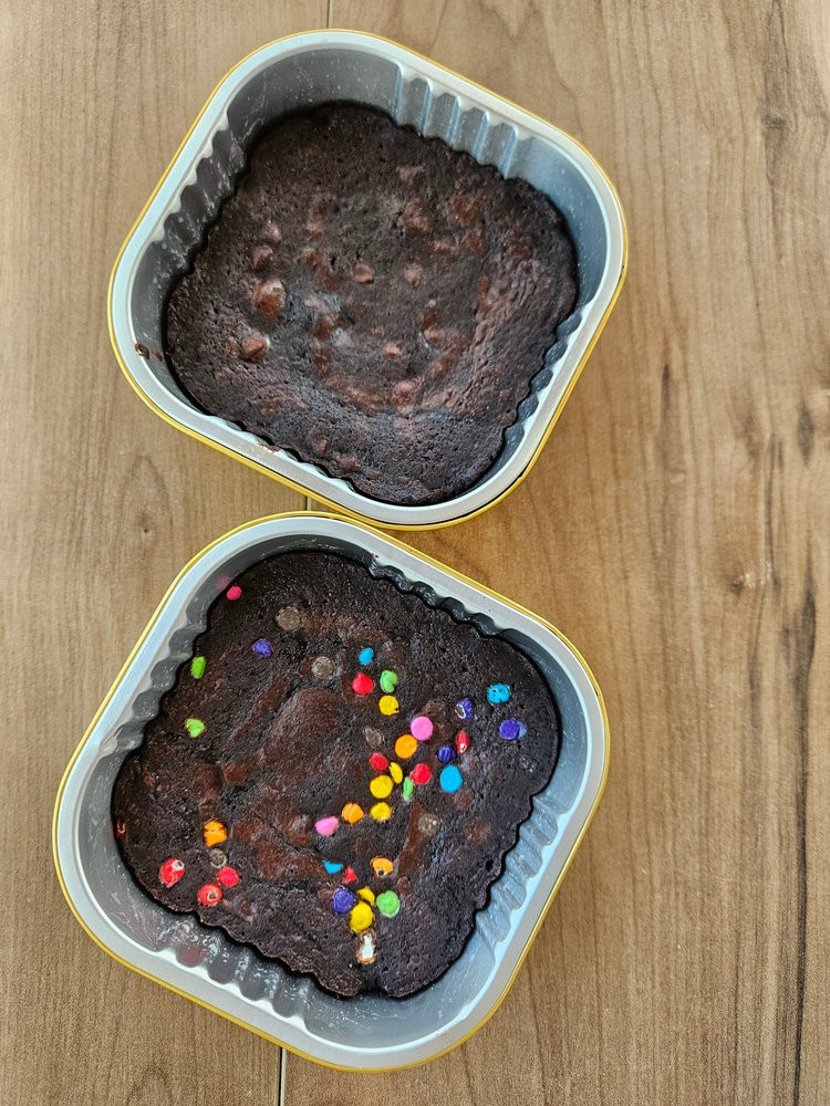 Fudgy brownies with chocolate chips in them. M&Ms can be added to the top.